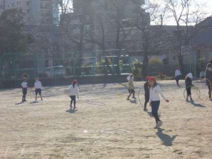 子どもたちは体育の授業で、縄跳びやフラフープに挑戦しています。