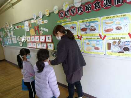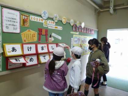 毎月、栄養教諭の北野先生が、食育コーナーの掲示板に栄養に関する掲示物を作成しています。おみくじを引いて「あ け ま し て お め で と う」の言葉カードを開くと、栄養についての説明が書いてあります。