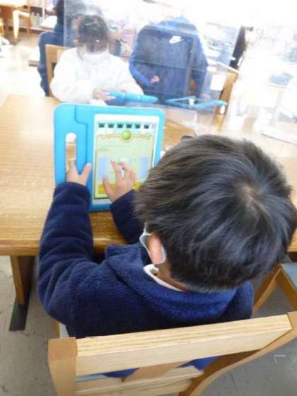 感染症対策をして、子どもたちは一生懸命に学習に取り組んでいます。1年生は学習用タブレットを使っておうちの人が小学生の頃の様子を発表しました。