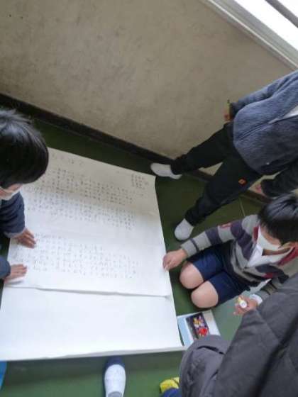 コロナ禍で、グループで集まっての話し合いや作業が進めにくいですが、学習用タブレットを活用したり、クラス全体で学びを共有したり、B紙を切って、担当ごとに個別にまとめたものを1枚に貼り合わせるなど、工夫して進めています。