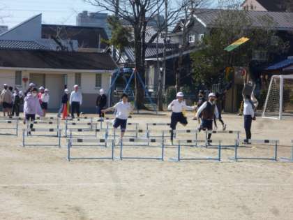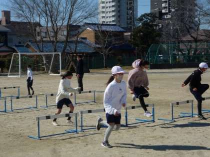 4年生が、体育の授業でハードル走を行っています。「跳ぶのが難しい」と言っていた子もいますが、徐々に慣れてきて、「1・2・3」のリズムで上手に飛べるようになってきました。