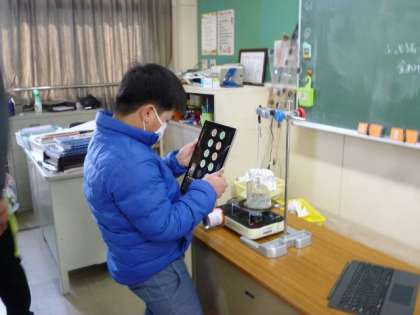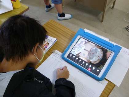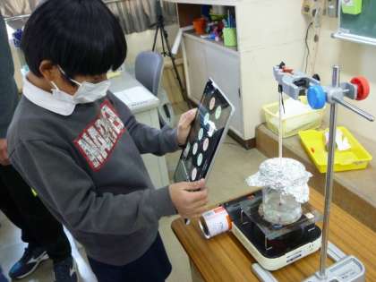 4年生の理科で「水を熱し続けるとどうなるか」という実験を行いました。時間がたつと温度や状態が変化することを、観察しています。児童が交代で動画を映し、クラス全員にオンラインで配信しています。