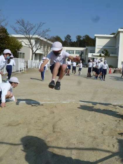 4年生が、体育の授業で走り幅跳びを行っています。助走スピードも上がり、踏切りもタイミングがよくなり、徐々に跳ぶ距離が伸びてきています。