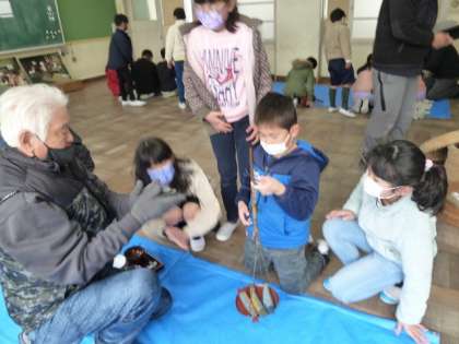 3年生が、郷土資料館の方を招いて、昔の道具の勉強をしました。初めて見る道具が多く、どのように使うのかわからないため、資料館の方に教えていただきました。「おもしろい」「使うのが大変」などと話していました。