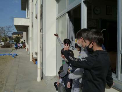 せんだんの木の根っこが掘り起こされるのを、1年生の子ども達がじっと見つめていました。「さようなら」「ありがとう」と、手を振っている子もいました。学習用タブレットを使って、写真を撮っている子もいました。