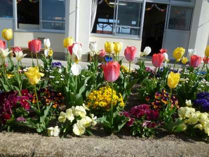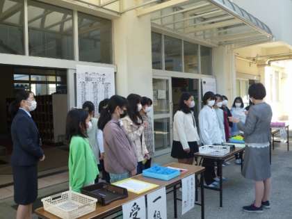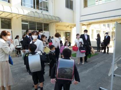 入学式のために、新しい1年生が登校してきました。自分のクラスを確認して、6年生のお姉さんに胸花をもらいました。わくわく・どきどきです。