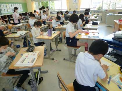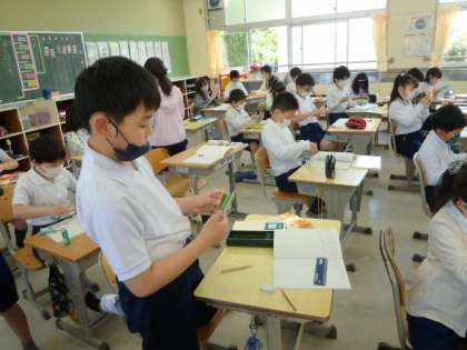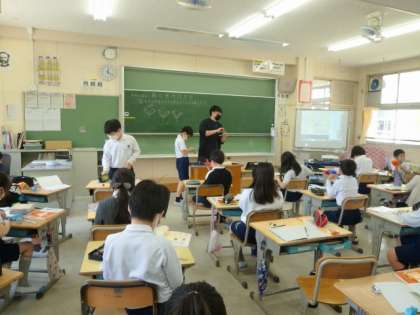 4年生の算数の授業で、角度の勉強をするために、折り紙で蛇腹を作りました。広げてみて、1周回ると何度でしょう。みんなで考えましょう。