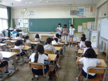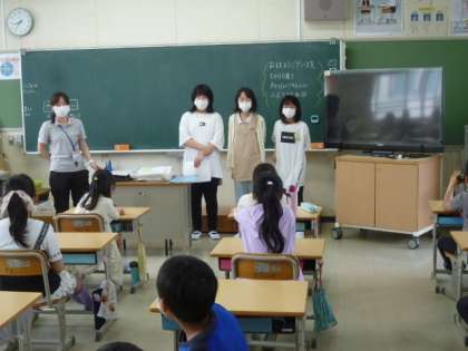 お昼の時間に、ふれあいタイム(縦割り班活動)を行うために、6年生が朝から各クラスを回って、下級生に連絡をするために、活動をしています。人前で話すことが苦手な子も、がんばって話をしています。