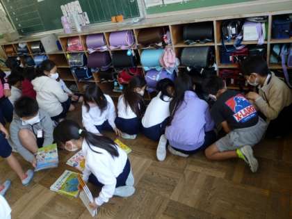 教室では、子どもたちが教室の後ろにあるロッカーの整頓をしています。