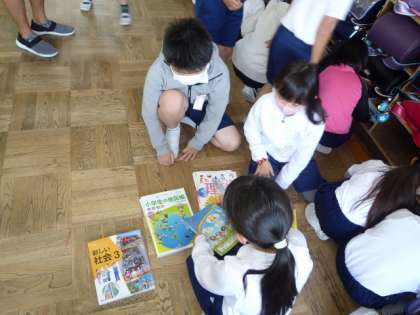 「同じ種類の本を一緒に置いたほうがいいね」と協力して並べています。