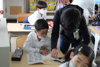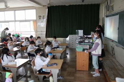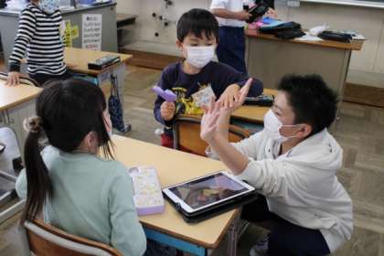 前に出見本を示したり、学習用タブレットで折り方を見せたりするなど、工夫して教えていました。