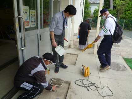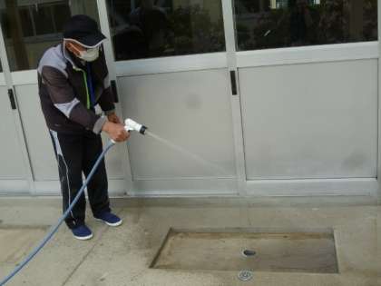 東昇降口の排水溝に枯れ葉や砂が詰まっていました。鉄板が重くて大人でもなかなか持ち上げられなくて困っていました。校内整備員の木戸さんが、「てこ」を使って外してくれたので、掃除をしてすっかりきれいになりました。