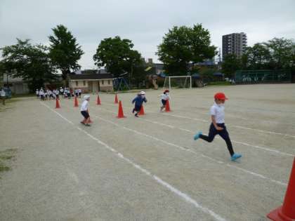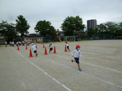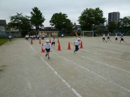 2年生の体育の授業で、折り返しリレーをしました。コーンをくるくると回って走るので、スピードをつけすぎると回りにくそうです。スピードを工夫して走れたかな。