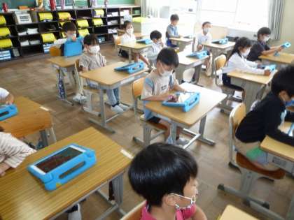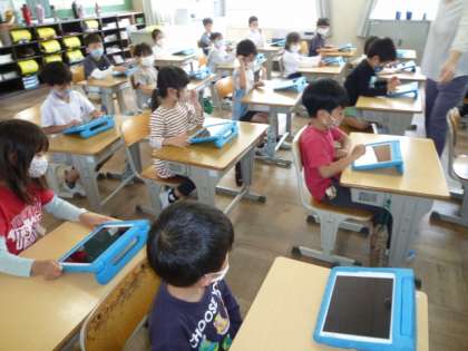 先生から、タブレットの使い方やルールを教えてもらっています。