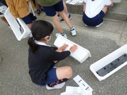 各クラスに、プランターを配り、ミニひまわりを植えて育てます。