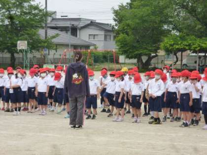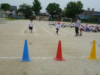 今日は、1年生・2年生が学年ごとにそれぞれ体育でかけっこを行いました。