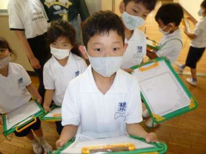 1年生が、学校中の先生の名前を知るために、サインをもらいに回っています。