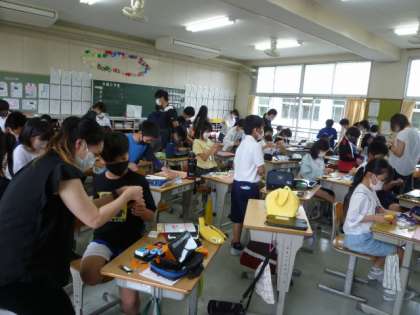 5年生が、キャンプの時に使う名札を、家庭科の時間に自分で縫って作りました。