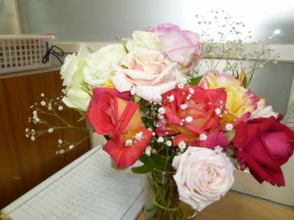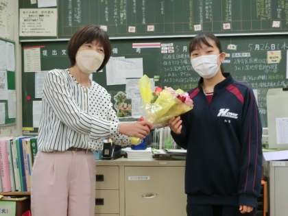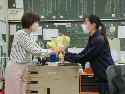 根川小学校の卒業生が通っている豊南中学校から、毎年素敵なバラの花束をもらっています。今年も、委員会の生徒さんが持ってきてくれました。