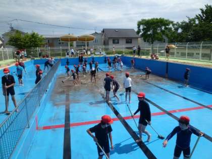 今日は、6年生と体育委員会・環境委員会が中心になってプール掃除を行いました。