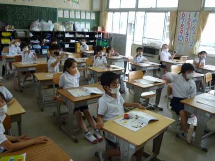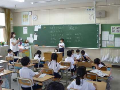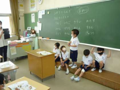 1年生が音楽の学習で、音楽に合わせてリズム内をしたり、「白熊のジェンガ」をしたりしました。とても楽しそうです。