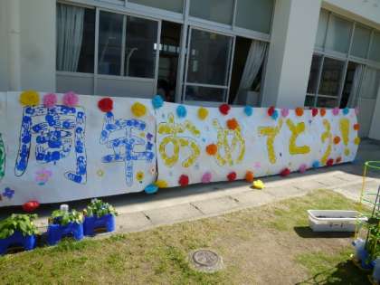 子どもたちの手作りの横断幕が飾られ、朝から、お祝いムードです。