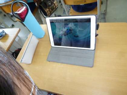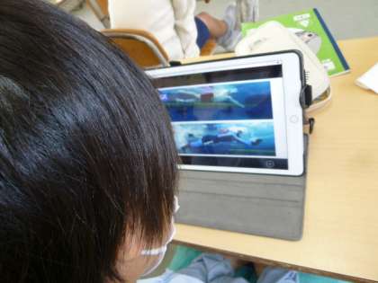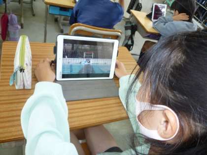 朝の時間に、5年生が学習用タブレットでNHK for Schoolの「体育ノ介」を見て、水泳に関する事前学習を行っています。