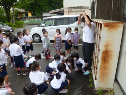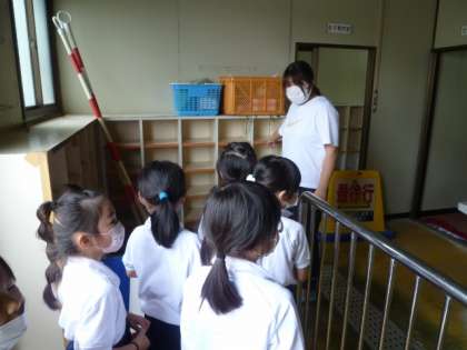 今日は、プールについての話を聞いたり、プールの場所やサンダル入れなどの場所の確認をしました。