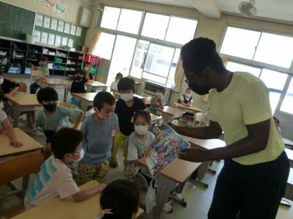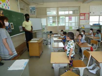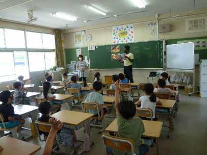 1年生が、ALTのワイットリ先生から英語を学んでいます。