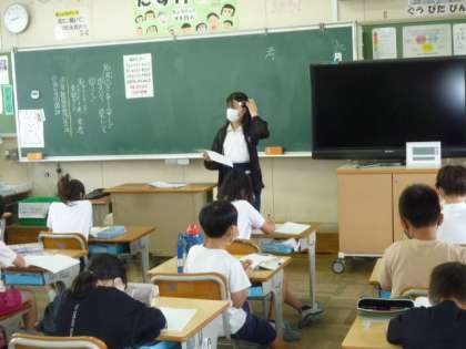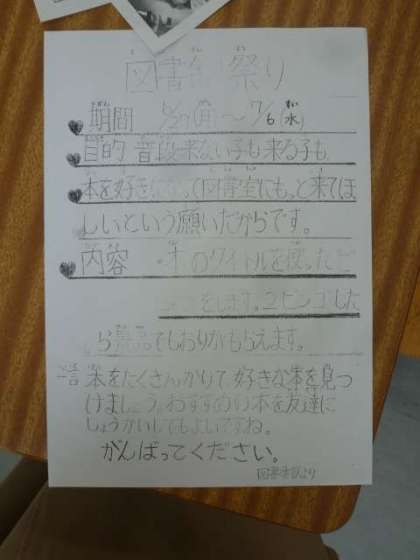 本に親しんでもらうために、図書委員会が「図書館祭り」を企画しています。今朝は、その宣伝に、委員会の児童が全校の教室に行きました。