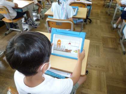 製本された本を読む子・学習用タブレットを使って電子の本を読む子・4年生が作成したおすすめの本の紹介プリントを読む子と様々でした。