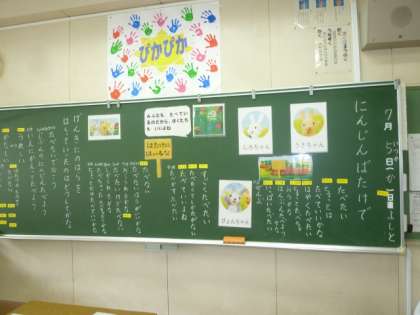 1年生が、「にんじんばたけで」の教材で道徳の学習をしました。「よくないとわかっていても、つられてよくないことをしてしまうことがある」「ともだちが廊下を走っていても、つられて走らないようにする」などと、話し合っていました。