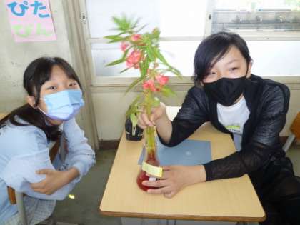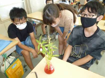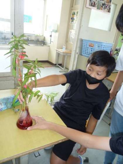 6年生が理科の学習で、植物の根が水を吸う様子を観察しています。