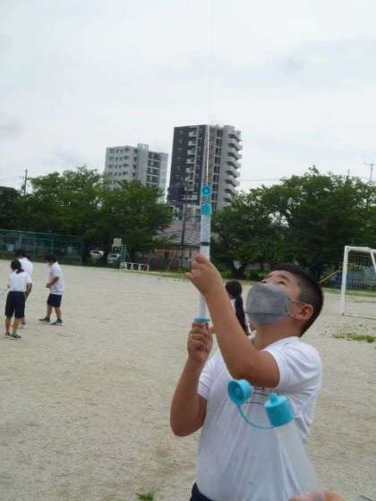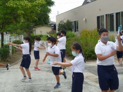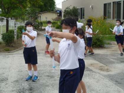 4年生が、理科の学習で水鉄砲を使って、水と空気の力の実験を行いました。