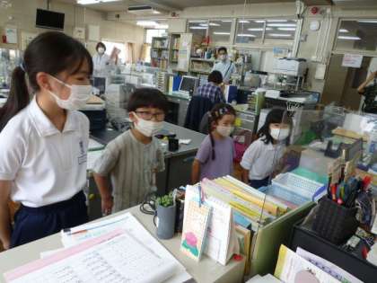 1年生が、放送委員の児童に助けてもらって、「なりきり放送委員」として学校放送をしました。初めての体験にドキドキしながら放送しました。