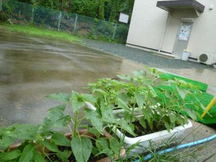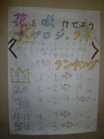 環境委員の子どもたちが学校でお花を育てて、きれいにしようという計画を立て、6月にミニひまわりの種を植えました。少しずつ大きくなってきました。