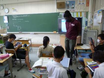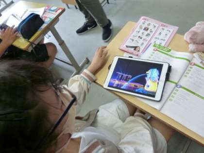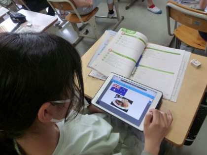 学習用タブレットでお気に入りの国を調べて、紹介しています。