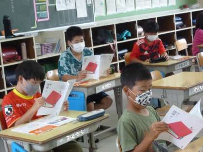 新しい教科書を配られ、真剣に読んでいるクラスもあります。