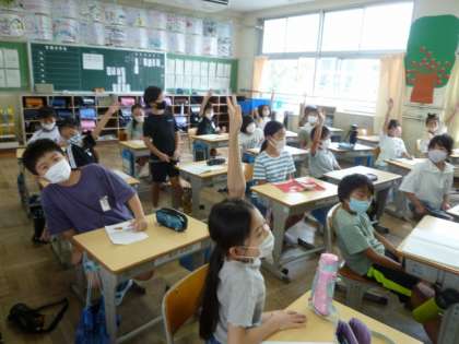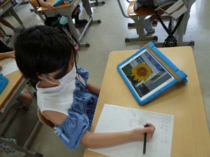 「ん」のつく言葉を考えるゲームをしたり、学習用タブレットで「ひまわり」の花を検索してスケッチしているクラスもありました。