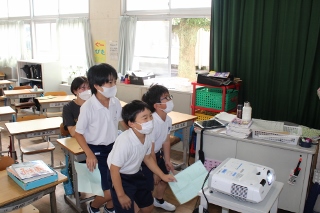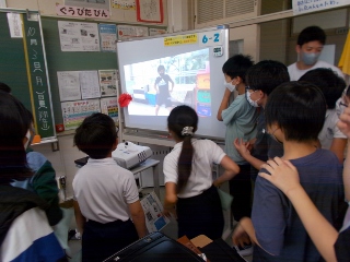 体育委員会が考えたダンスを事前にタブレットに録画し、各教室で体育委員が踊っている様子を映像で流し、訪れた児童がその映像を見て一緒にダンスをしています。