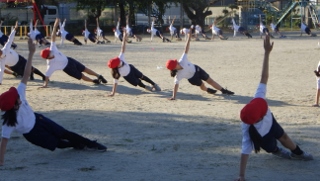 先日、5,6年生が初めて運動場でスタンツの練習をしました。