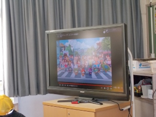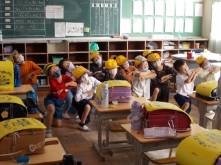 1年生が、帰りのお仕度をすませ、教室の後ろで運動会の練習をしています。