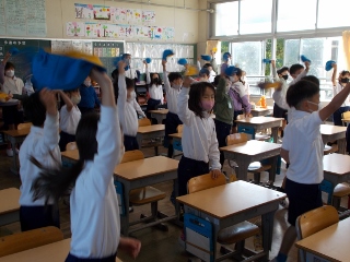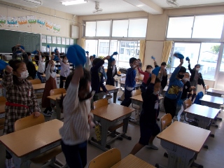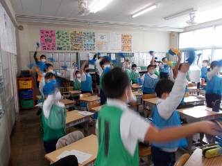 6年生が応援の仕方を考え、朝の会の時間に1年生〜5年生の教室に行って、応援の仕方を教えています。6年生全員がリーダーとして頑張っています。