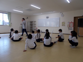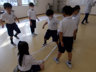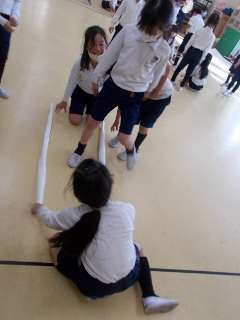リズムに乗って、紙の筒を竹に見立てて、バンブーダンスならぬペーパーダンスをしていました。楽しくリズムに乗って踊れました。