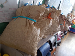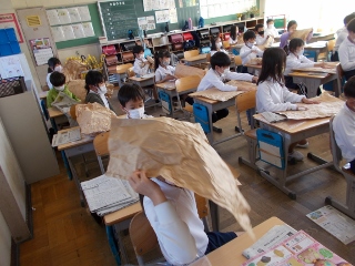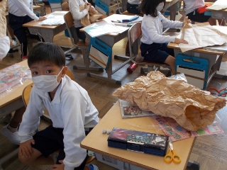 2年生が、紙袋をくしゃくしゃにして、できた形から動物や物など何かを作ろうとしています。「かみがやわらかーい」「くしゃくしゃにするのがきもちいい」など、感想を言いながら作っていました。どんな物ができるか楽しみです。