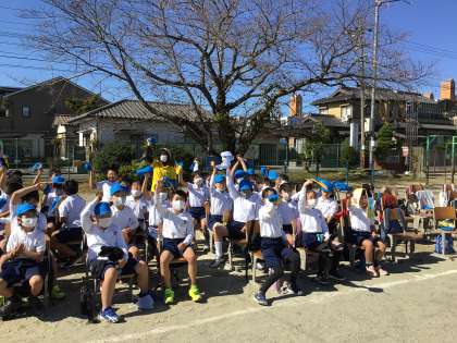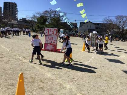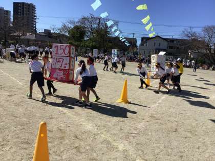 11月2日 段ボール3つを積んで走るのは、大変そうです。 下級生も応援しています。