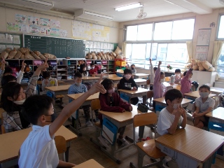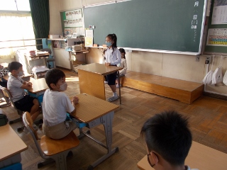2年生がスピーチを行っていました。運動会や、お休みの日などのことを話していました。みんなの前でも堂々と話し、周りの子どもたちも、それを聞いて反応したり質問したりしていました。