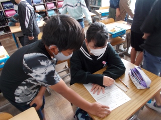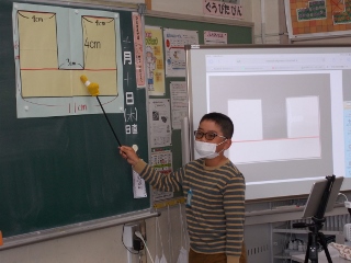 自分の考えた面積の求め方をタブレットに書き込み、それをスクリーンに映してみんなに説明しています。