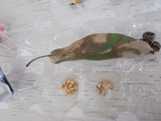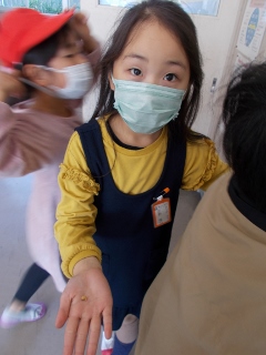 1年生が、どんぐりゴマを作っているときに、どんぐりの中からどんぐり虫が出てきました。子どもたちは、どんぐり虫に夢中です。たくさん集めて卵のパックで飼っています。手に持って見せてくれました。