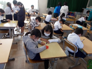 感謝の会の用意をするために、6年生が折り紙のお花を作ろうと考えました。今日のふれあいタイムで、各学年の児童に折り紙の作り方を教えました。